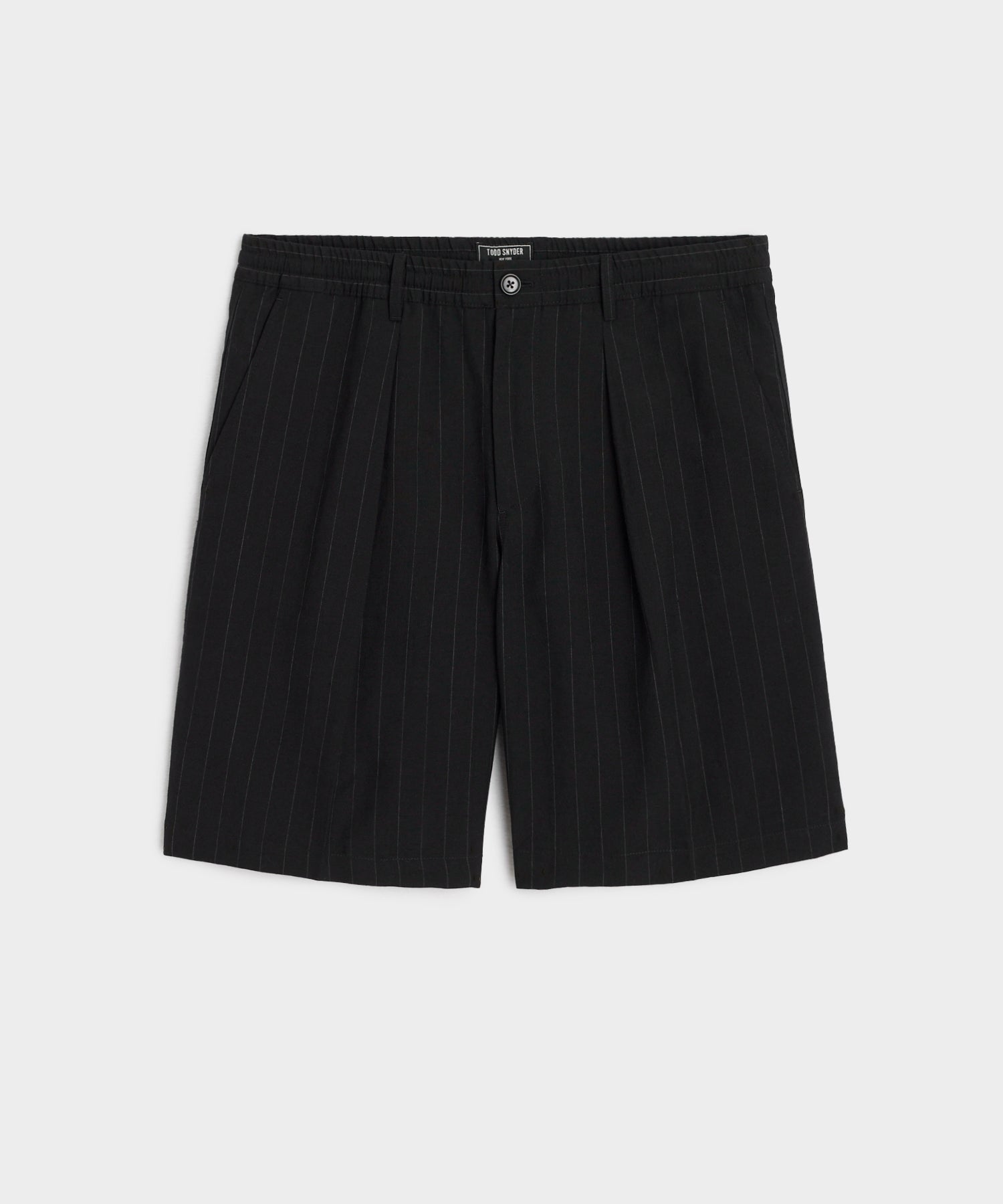 These easy-wearing shorts have a vintage vibe thanks to a full. relaxed fit and lengthy. 10” inseam. designed to hit right around the knee. They're crafted from a breathable wool and linen blend with a dry handfeel. from the renowned Sondrio Mill in Italy; the subtle black-and-gray pinstripe goes with almost anything. A single reverse pleat at the front helps tame the extra volume for a full but tailored look. Try them with a tank and a short-sleeve Camp Collar or Cabana Shirt worn open. as a layer.