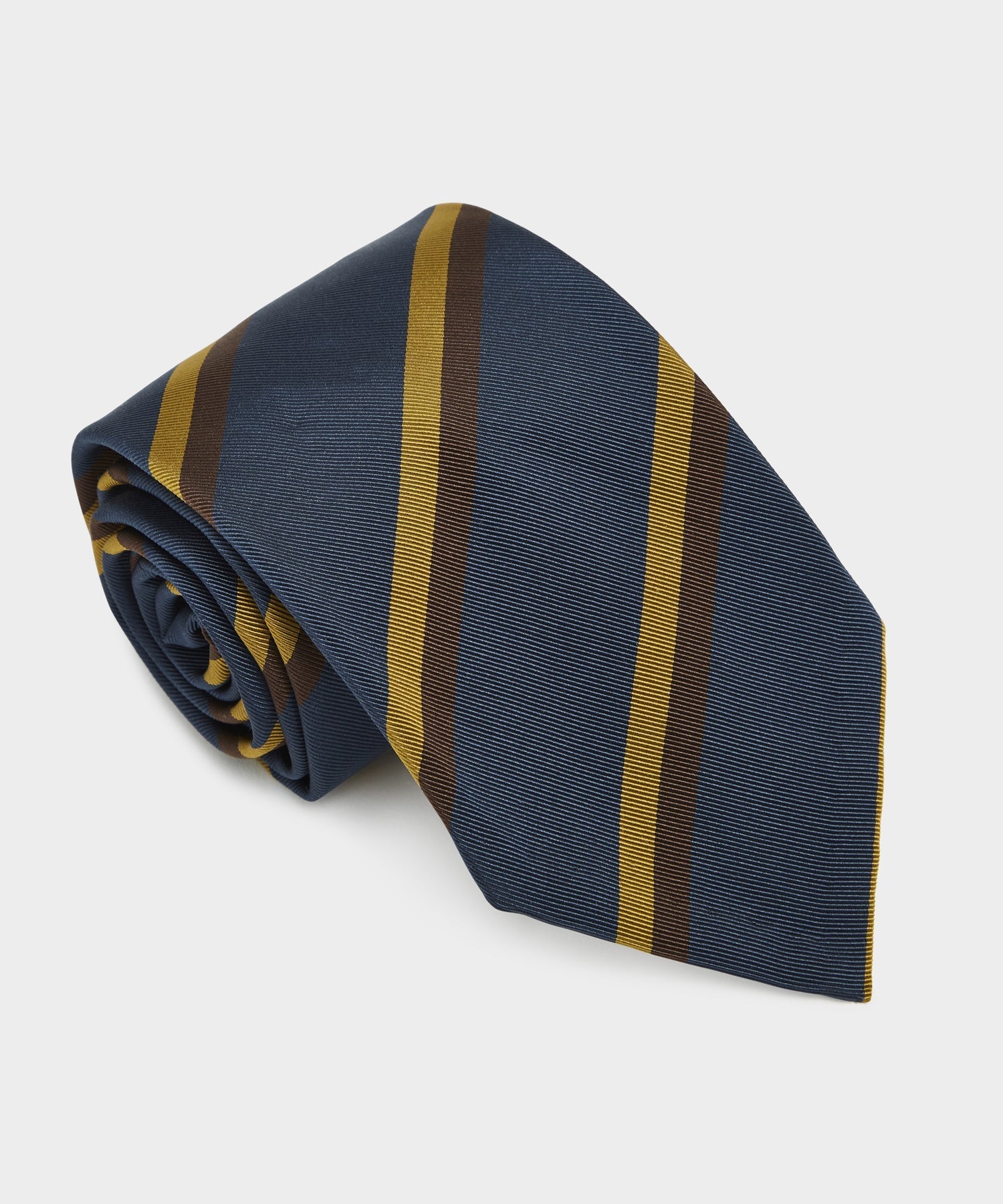 Our hand-stitched and untipped ties are constructed in Italy. and pair perfectly with any suit. sport coat or jacket. This particular tie is made with premium silk and cotton from the United Kingdom's revered Stephen Walters mill. which has been weaving fine fabrics for over three centuries. Both timeless and contemporary. the classic blue-and-gold striped pattern is inspired by textiles in Stephen Walters' extensive historical archives.