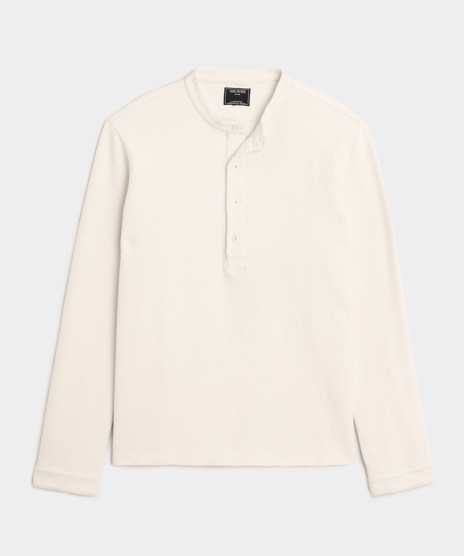 This unique shirt mixes different elements Todd loves — a chic band collar. an athletic henley-style placket. a nubby Portuguese cotton boucle. The fit is on the generous size. gently relaxed. with a vented hem for full range of movement. A button placket at the cuffs adds a tailored touch. and the fabric is a little rugged. but soft on the inside. like a heavy tee. Put together. it's the kind of shirt that you'll want to throw on as soon as you get out of bed. but will look just as good under a sport coat as it will working from home on the couch.