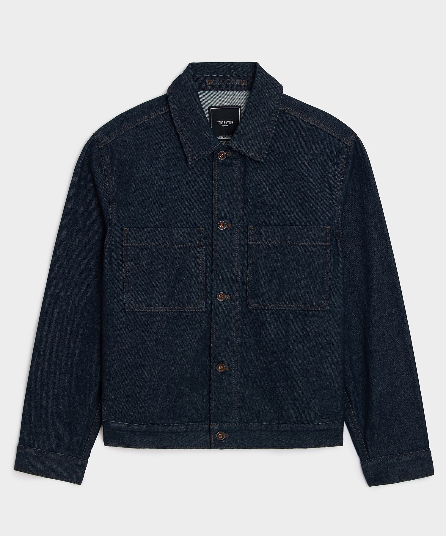 Inspired by mid-century American workwear. Todd has reimagined the iconic denim jacket for the modern sensibility. The fabric is a true 13.5 oz indigo denim; it's given a unique resin wash that turns it a slightly darker shade. for the look of raw denim without the stiffness. Details include shank buttons at the cuffs. placket and the tabs at the waist. which you can adjust for the perfect fit. It has a modern. boxy. slightly oversized silhouette. with a slightly dropped shoulder and clean detailing throughout. Perfect over a tee when it's warm out and a sweater when it's not. it's an excellent way to play with proportions — particularly when worn with the matching Barrel Jeans.