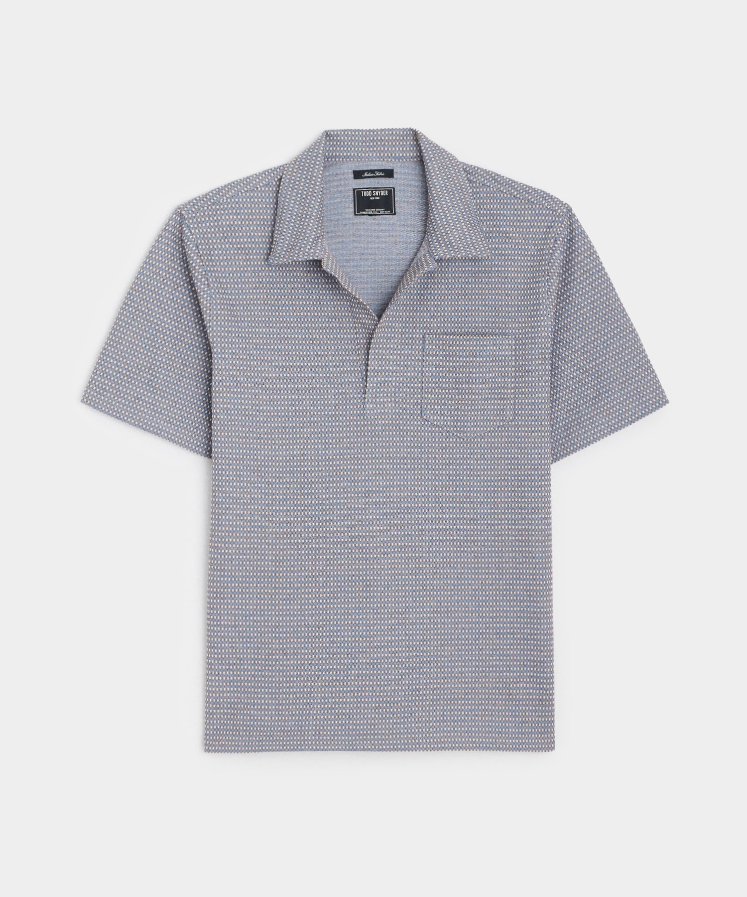 Our bestselling Montauk Polo silhouette gets reimagined in an Italian cotton and linen blend that's made for layering when it's cool and wearing all on its own in warmer weather. It features a small basket print in brown. blue. and ivory that reads as a neutral from a distance. Our signature Johnny collar sits on top of a deeper-than-usual placket for a modern look that complements the slightly relaxed. boxy fit. We like this styled casually. thrown on with your favorite trousers and a pair of loafers.