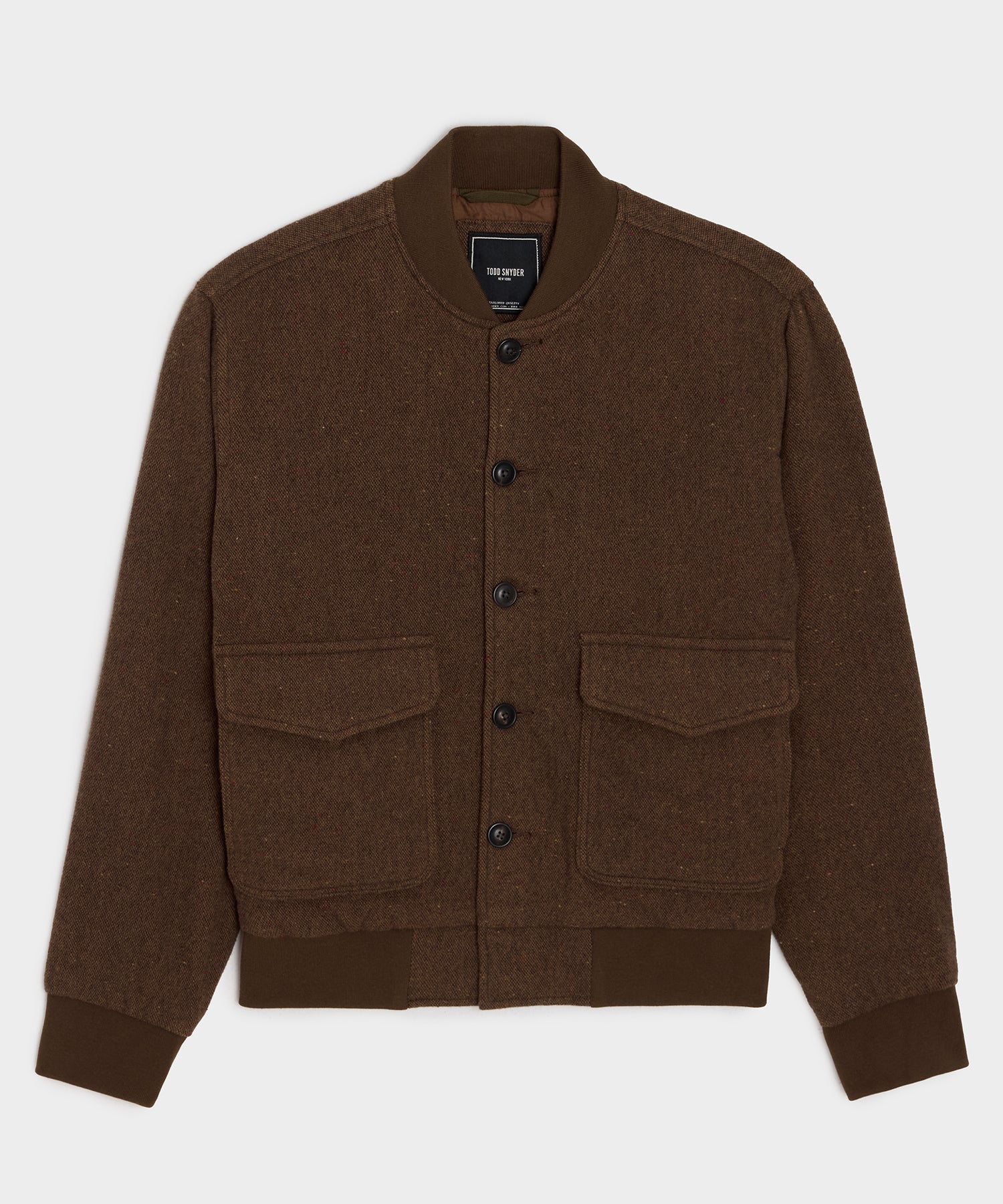 This cozy jacket is made from a warm. rugged wool Donegal. with subtle flecks of cream and red on a soft brown base. “Donegal.” named after the county in Ireland where it originated. refers to a technique where small pieces of yarn in different colors are woven in at random to create a speckled effect. The classic silhouette features horn buttons at the front and knit ribbing at the collar. cuffs and waist for a gently rounded look. You can wear this as a light layer. or treat it like you would a cardigan.