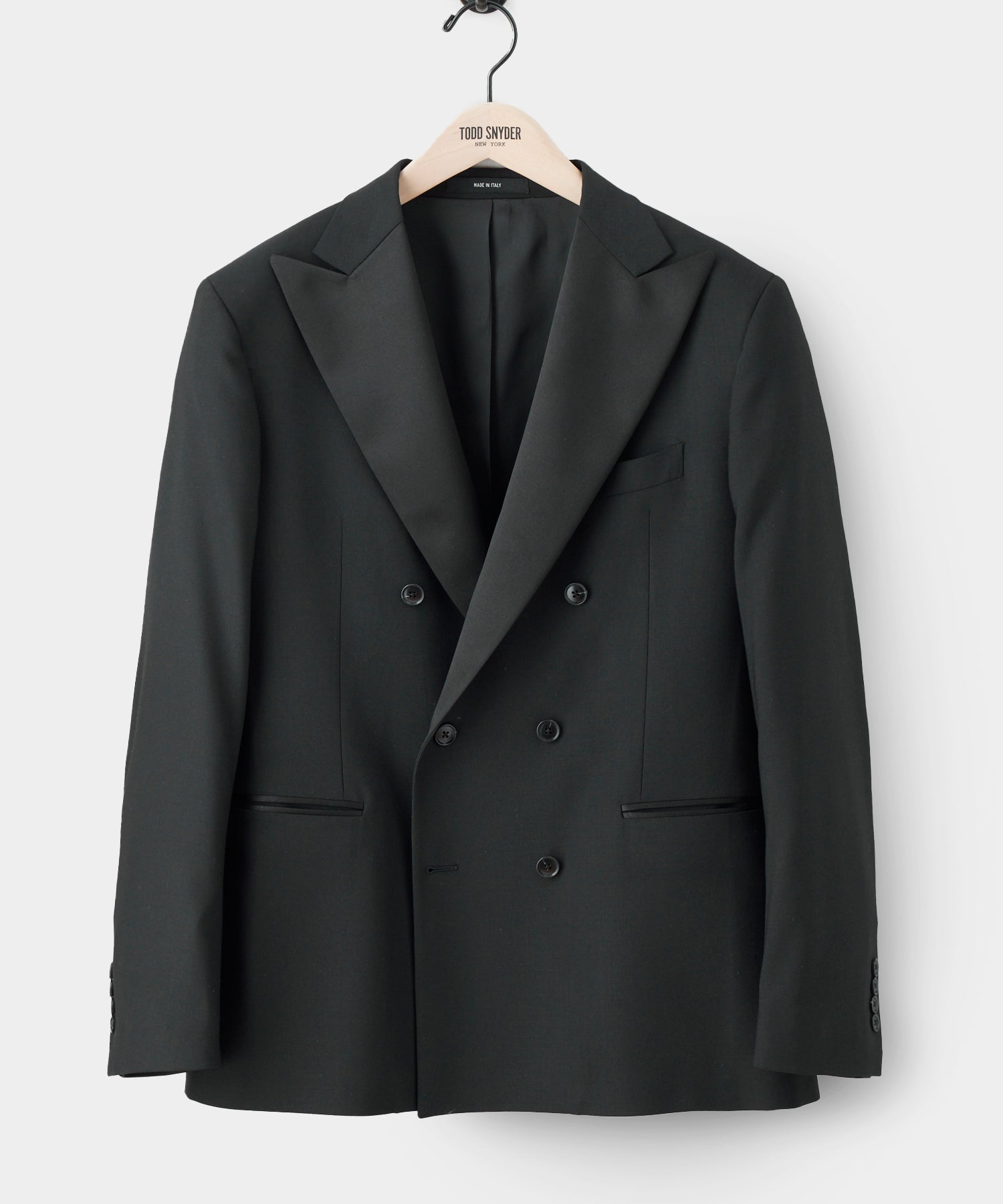 An essential for the sharp dresser. our luxurious Tuxedo Jacket is crafted in a handsome black wool from the renowned Italian mill. Tollegno 1900. This double-breasted take is a chic update on everything you love about the classic: modern. impeccable tailoring with a slim. tapered fit and a natural shoulder. Premium details include a wide satin peak lapel and genuine black horn buttons. Whether you go black tie and pair this with the matching Tuxedo Pants or treat it as a stand-alone piece for other looks. it's a timeless. versatile choice for any special occasion — especially if you add one of our dress shirts and a bow tie to the mix.