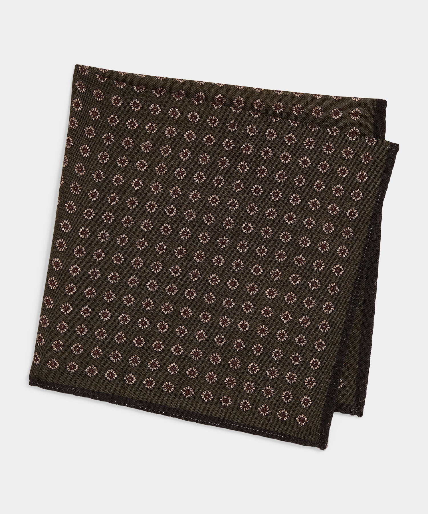 For a dash of old-school cool. nothing beats a pocket square — chic but unfussy. they're the perfect finishing touch for any suit. This one is made from a soft wool that's light enough to wear year-round. in a timeless floral pattern. and comes to us from the renowned experts at Mantero. Pro tip: when it comes to pairing your pocket square and tie. try to pick one with an accent color that matches your tie's base shade.