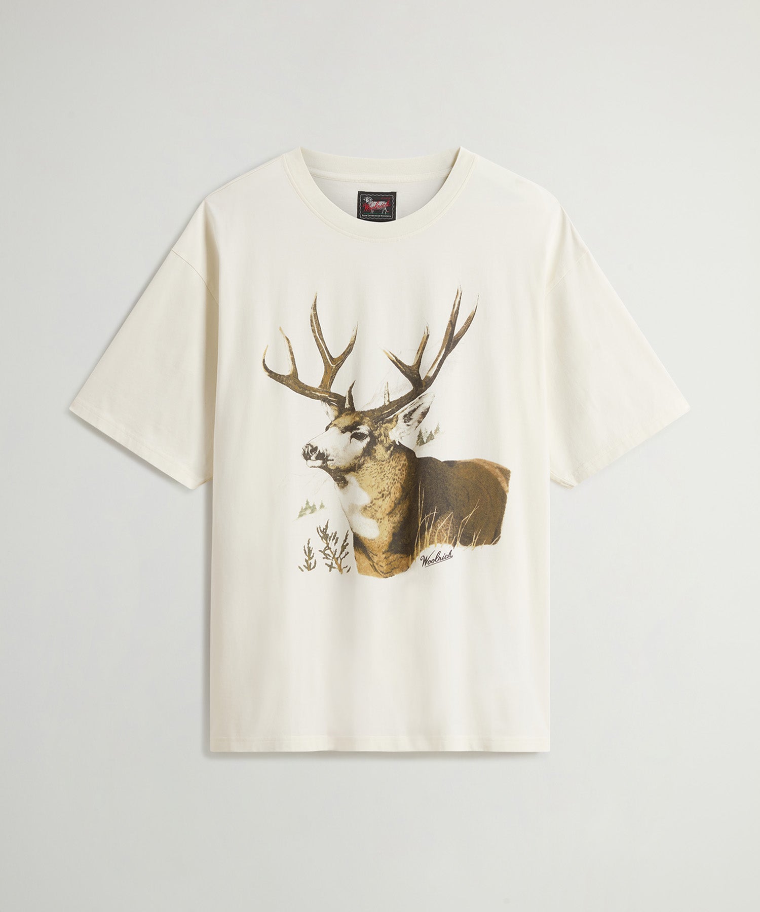This graphic tee is crafted from a soft but sturdy medium-weight cotton Jersey. The fit is easy and modern. with a boxy. relaxed silhouette. a higher-than-usual crewneck collar and an open hem. TheWoolrich logo and a stag's head image pulled from the archives are screen-printed at the front.