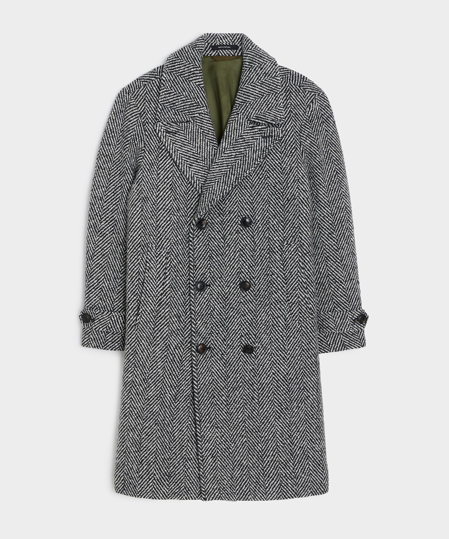 This is a classic topcoat with a sartorial. Todd Snyder twist. The fabric is a handsome Italian wool blend in a graphic. oversized cream-and-black herringbone. It features premium detailing. including a double-breasted front and plenty of practical pockets. The fit is full and oversized. for a chic. on-trend look that layers beautifully. It's designed to hit below the knee and looks equally good thrown over denim and a sweater as it does paired with trousers and a button-down or a full suit.