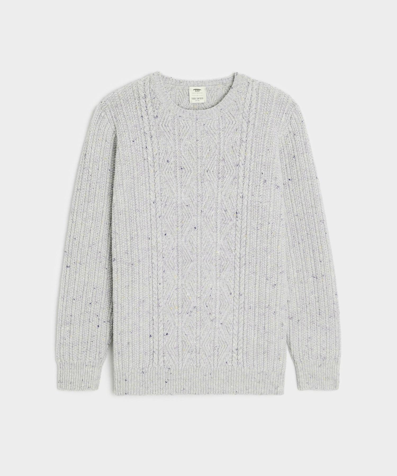 This warm crewneck is knit from a plush. rustic yarn that blends merino and cashmere. It's a Donegal. which refers to a technique where small pieces of yarn in different colors are woven in at random to create a soft. heathered effect — in this case. flecks of yellow and navy on a gray ground. A variety of cable stitches give it a classic look that works with any outfit.
