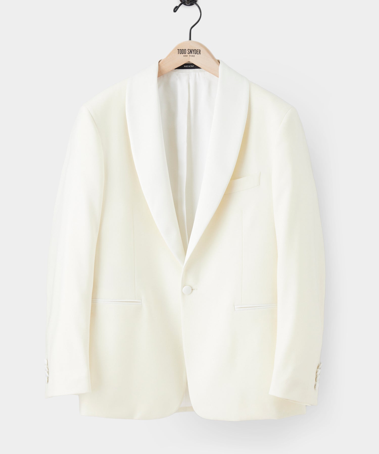 An essential for the sharp dresser. the fabric for our luxurious Ivory Shawl Collar Tuxedo Jacket is sourced from the renowned Tollegno Mill in Italy from a comfortable wool — classic. not too hot. soft. and woven with a bit of stretch for comfort. Premium details include a satin shawl-style lapel and satin-covered buttons.