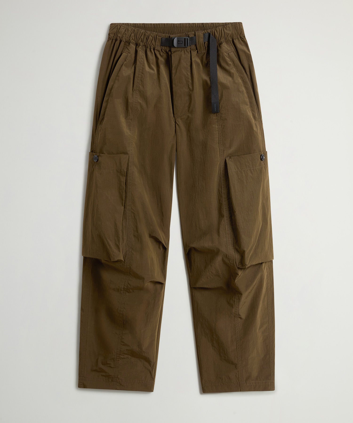 These lightweight pants. which hit just around the ankle. are made from a technical cotton fabric. They feature utility-inspired detailing. like oversized cargo pockets and a tech belt with the Woolrich logo at the waist.