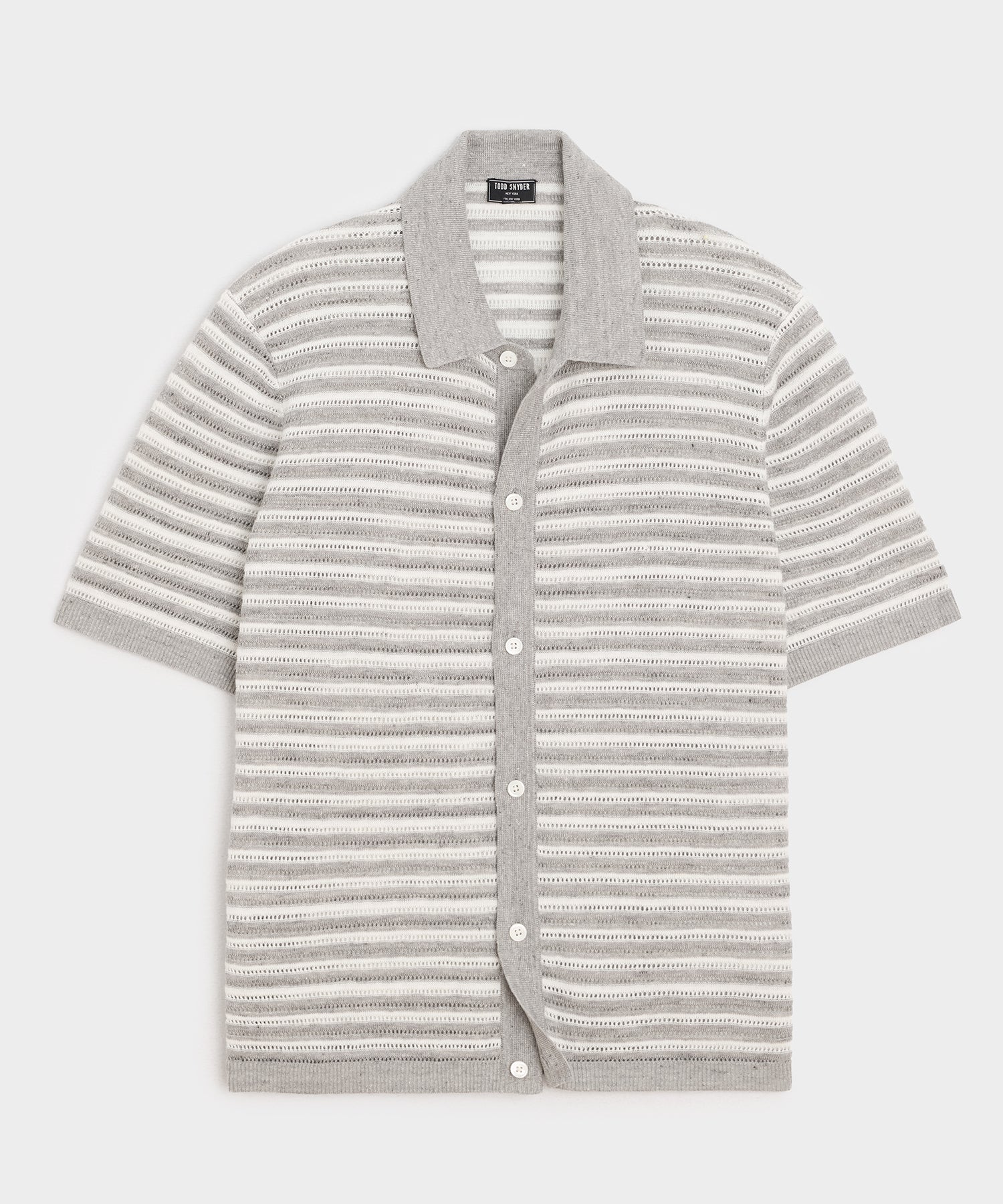 If summer were a sweater polo. this would be it. Knit from pure Italian linen. it has a remarkably soft and lightweight feel. It's complemented by an airy pointelle stitch. which creates a small dot pattern along the horizontal gray-and-white stripes. Breathable linen. the slightly open nature of the pointelle and an easy. cropped fit all make this the perfect pick for off-duty spring and summer days. whether you're at home or on vacation.