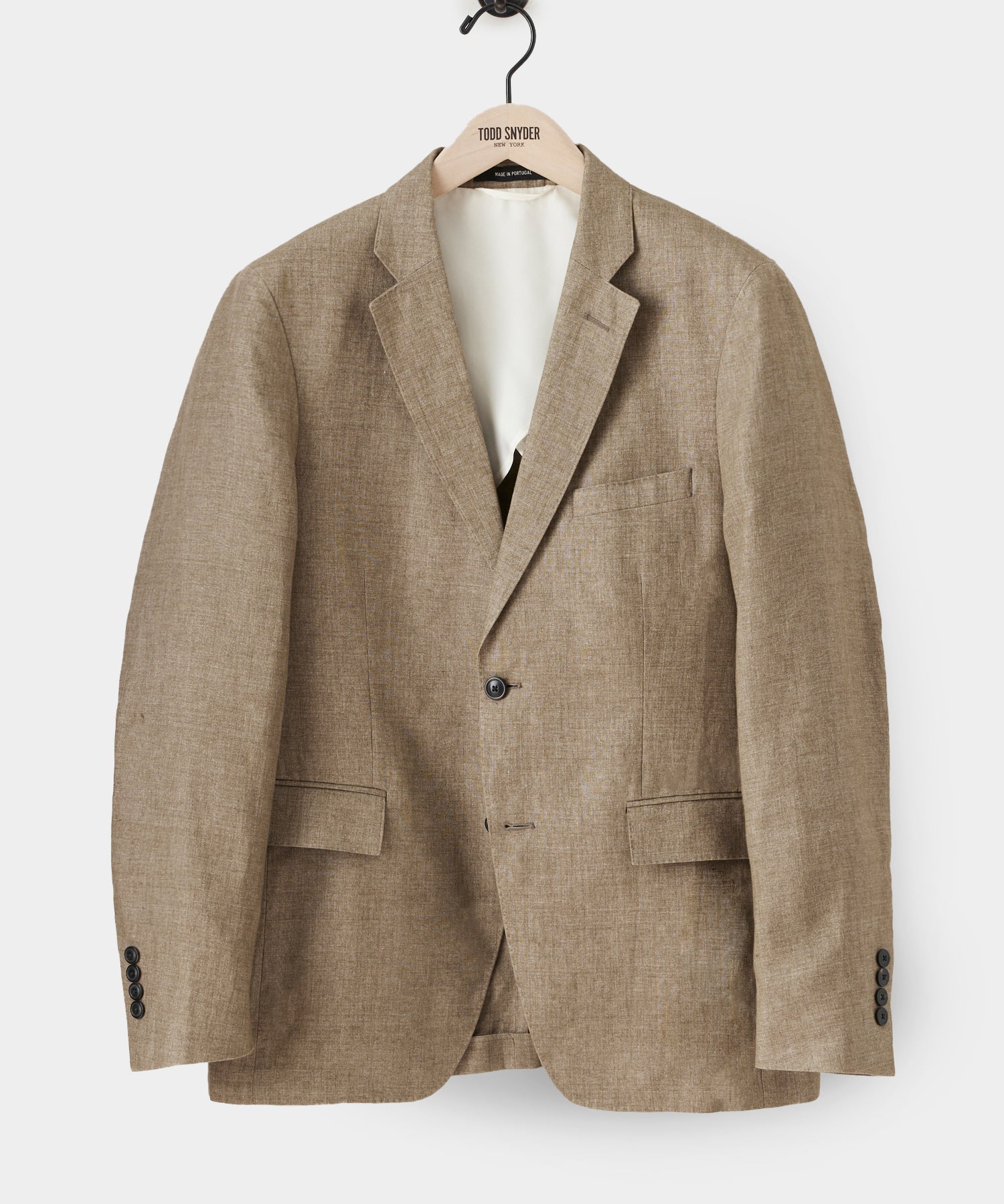 Our Sutton Suit Jacket offers a spin on a tailored sports coat; if you're looking for a suit that doesn't feel like a suit. you've found it. The fabric — a goes-with-anything tan linen — is from Italy's renowned Subalpino Mill. This two-button jacket features design details like a partial lightweight lining and pick-stitching at the lapel. which gives it a handmade feel. The overall effect is clean and tailored. refined. but still easy-wearing.