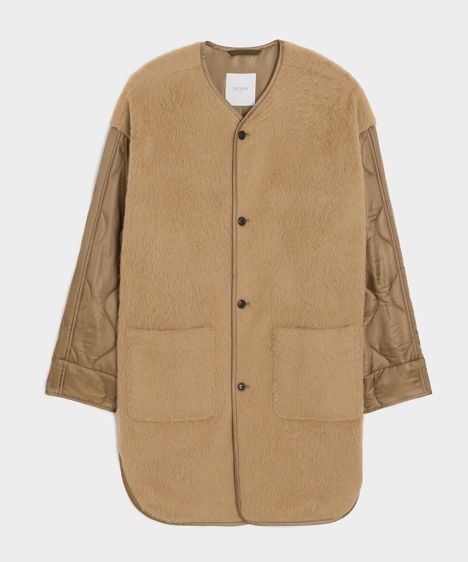 This unique jacket makes a serious statement. The body is made from an Italian fabric. a fuzzy. long-haired alpaca; the sleeves are quilted nylon. and the piping at the seams is the same nylon. The overall look is reminiscent of liner jackets. typically meant to be worn inside parkas. while the silhouette itself is inspired by baseball jackets — the collar. placket and curved dropped hem especially; because this jacket is on the longer side. hitting just around the knees. the unusual hem still allows for easy movement. If you prefer a less slouchy-chic fit. try sizing down for something more classic.
