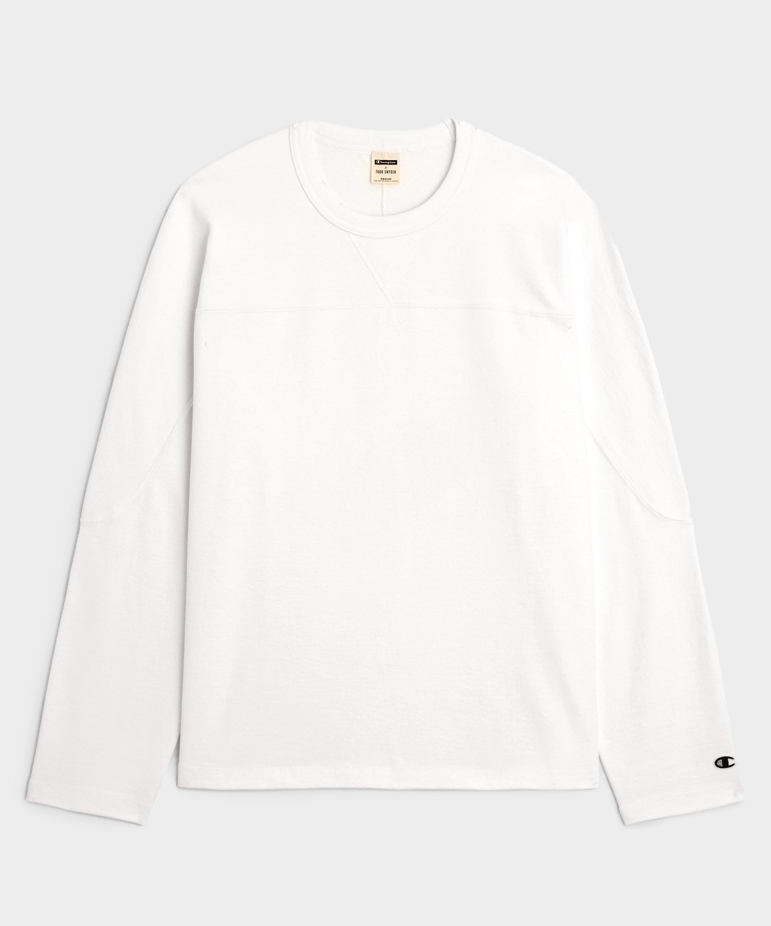 Inspired by retro athletic pieces. this long-sleeved tee — a traditional sideline style — has an easy. relaxed fit. and is crafted from a heavy but breathable cotton Jersey made in Canada and cut and sewn at WS. a family-owned factory outside Toronto that has been making things the old-fashioned way for decades. It sports a yoke seam integrated directly into the sleeve (originally designed to be worn over shoulder pads). A boxy fit and flatlock coverstitching throughout seal the deal.