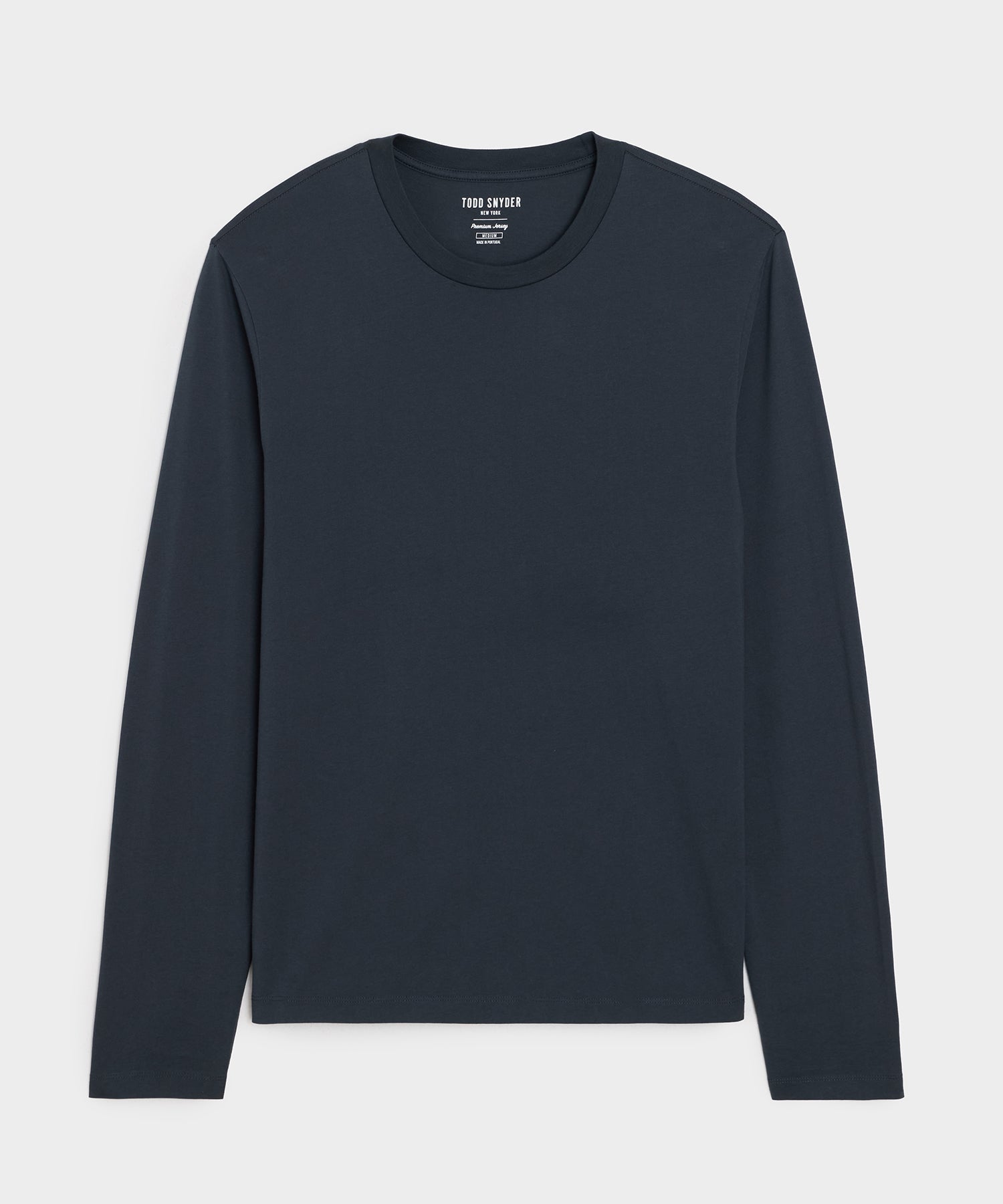 This clean. classic long-sleeved tee is a year-round staple. It's crafted from an all-cotton fabric we call “Premium Jersey.” Named for the largest of the Channel Islands where it originated. off the French coast of Normandy. Jersey is both solid and opaque. but also soft and breathable. Its structure gives it good drape and makes for an excellent base layer. Ours is made from piece-dyed and garment-washed Portuguese cotton. which has a smooth. dense. extra-soft handfeel. The ultimate basic. this tee is always down to smarten up a pair of jeans or get to work under a suit.