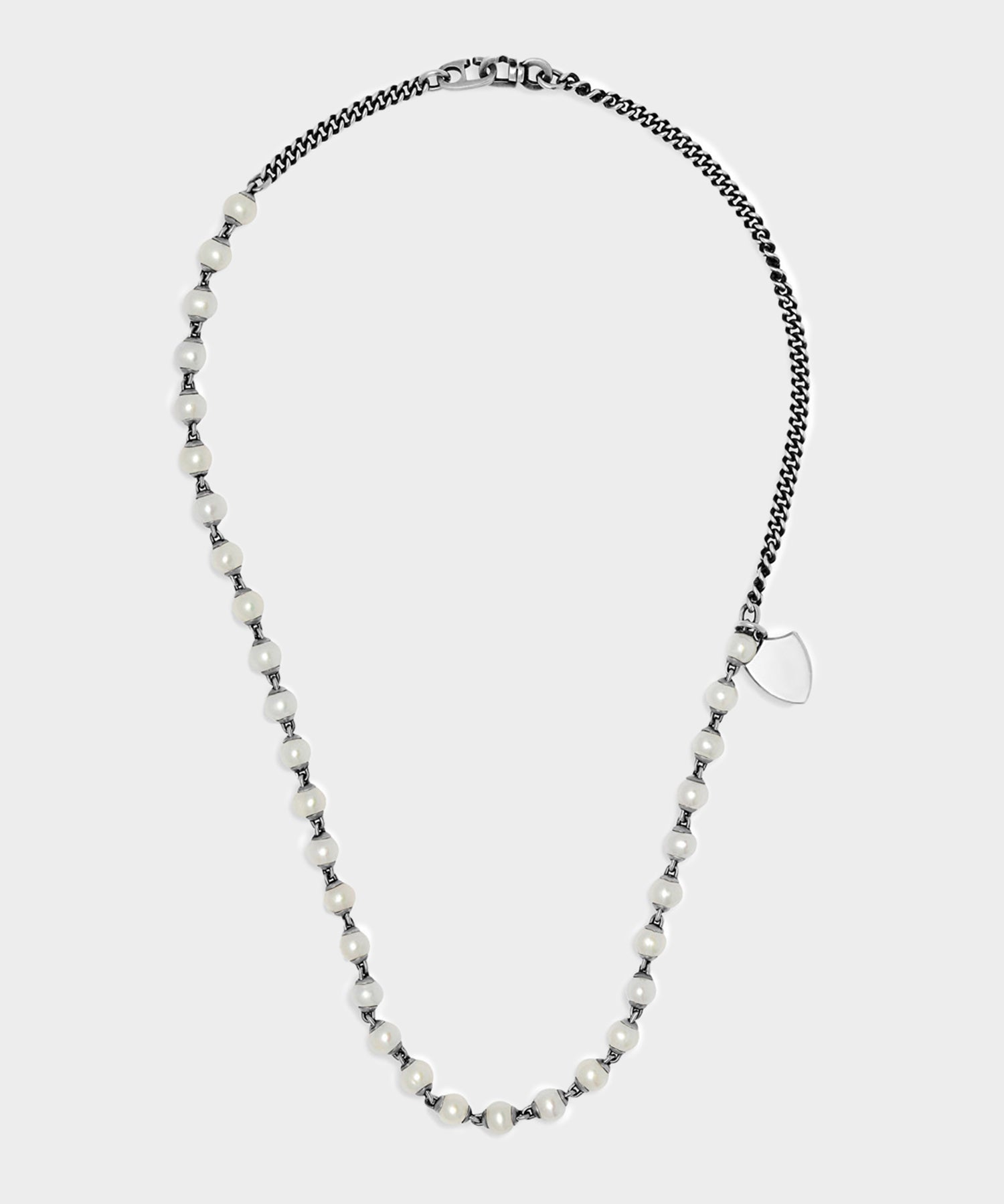 South Sea white pearls in small size are combined with a 925 sterling silver link chain and accented with a flat silver shield pendant. and using the kissing closure on this necklace. Use alone or as a layering piece.