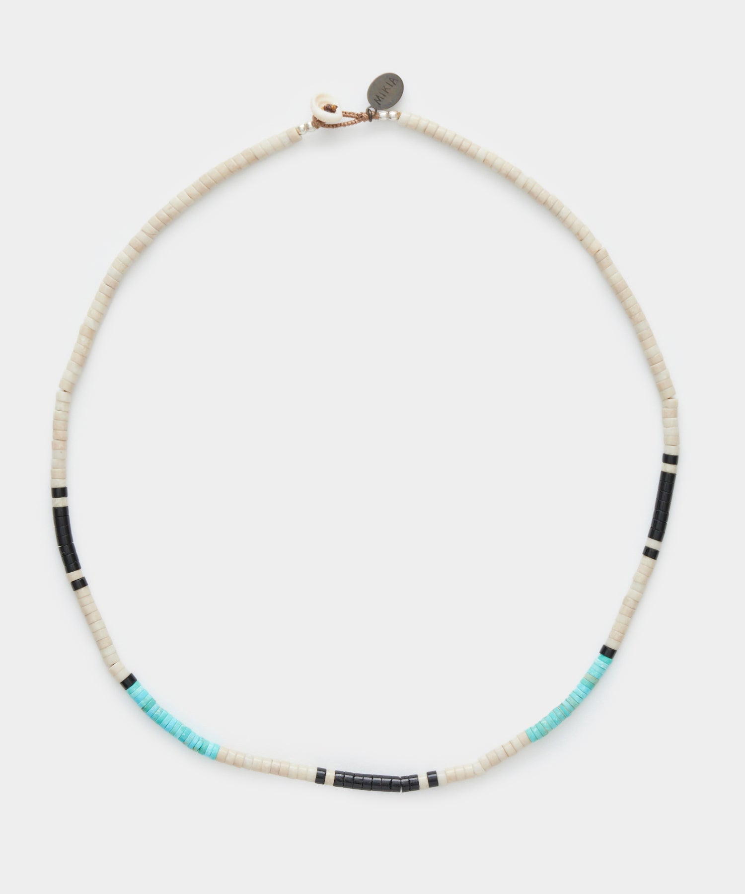 Get a taste of Mikia's founder - Aki Mitsubayashi – global adventures with the Heishi beads necklace. It's made from a mix of turquoise shell. bronzite and brown wood jasper. then fastened with a pukka shell clasp.