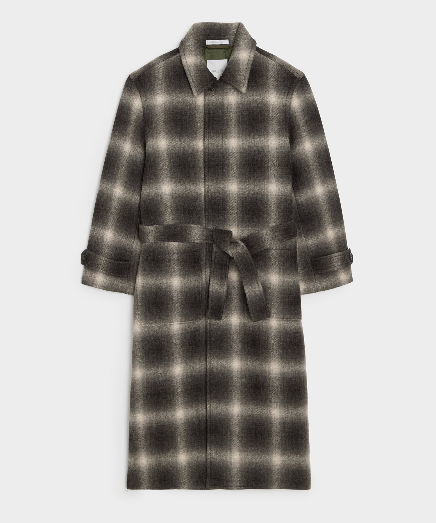 This chic overcoat is crafted from a soft and luxurious Italian wool-and-alpaca blend in a handsome shadow plaid. in shades of cream and gray. The fit is gently oversized but still tailored. with a classic point collar and raglan sleeves. The clean placket hides the genuine horn buttons beneath it for a sharp. minimal silhouette. Other design details include four pockets (two interior. two exterior) and an adjustable belt.