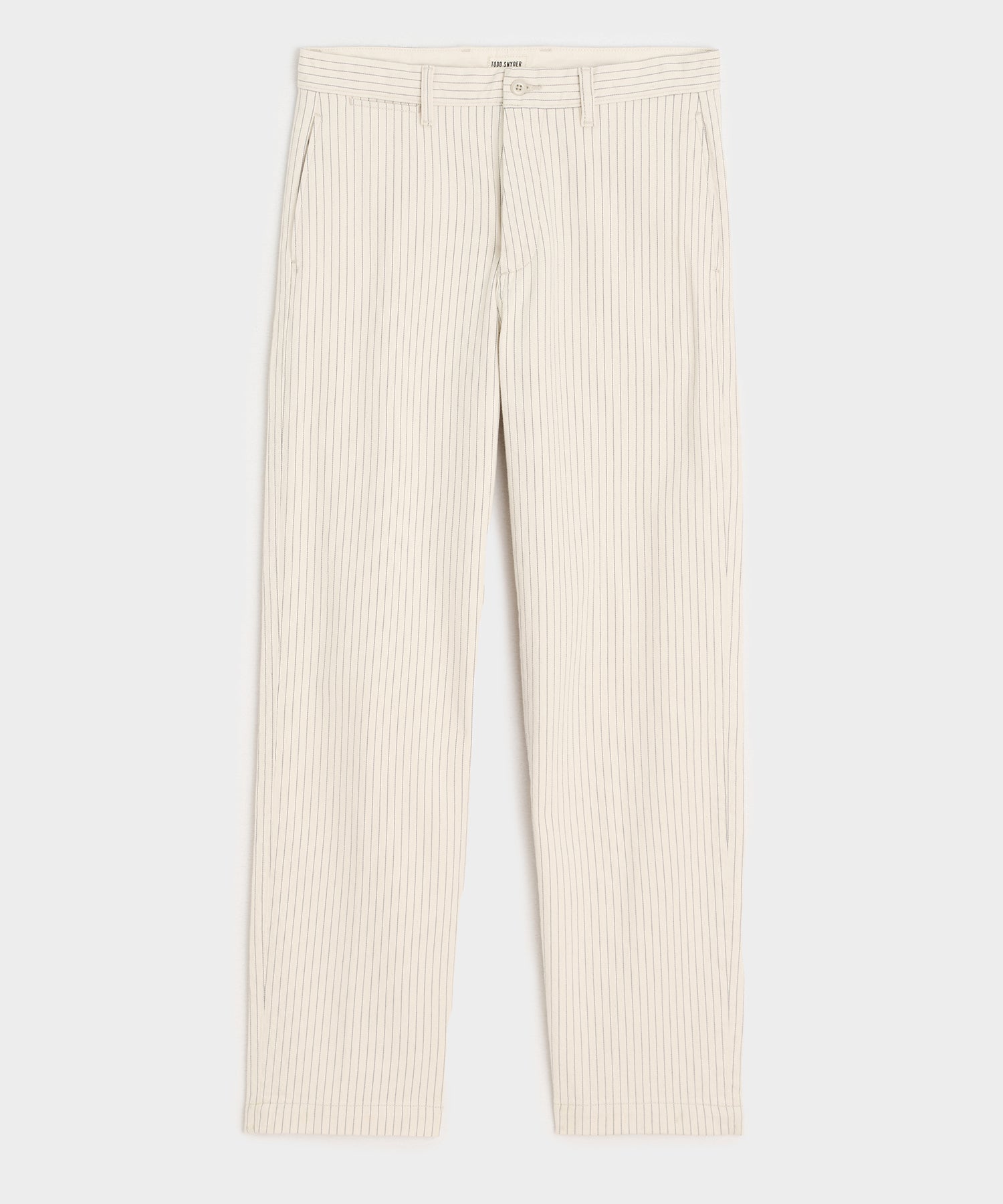 Our military-inspired chinos feature all the key elements of this classic style that Todd loves most: an easy. wear-with-anything fit; clean styling; and a traditional button fly. They're crafted from an all-cotton twill fabric that's rugged and gutsy. in a soft cream with a mid-blue stripe in a play on iconic workwear patterns like the hickory stripe.