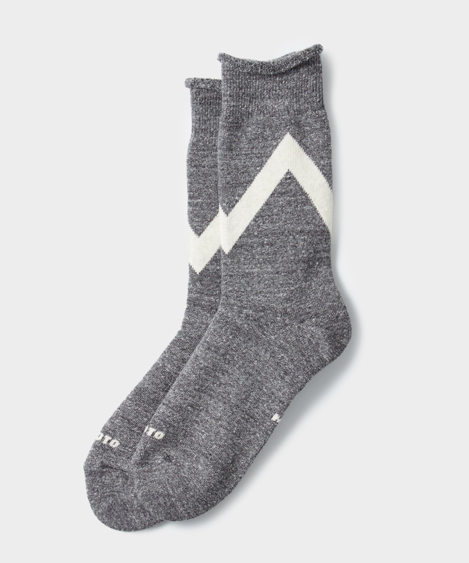 The cotton fabric of these soft piled socks is modeled after vintage sweatshirts. For a more similar look. each sock is knitted with Raffy yarn. uneven yarn produced by blending 25% of cotton waste in long staple cotton. To maintain the unique uneven feel. the yarn is slowly spun at Japanese factories with a spinning method that has not been changed for over 50 years. The irregular surface is not seen on modern mass-produced products. adding a retro feel like vintage sweatshirts. The zig-zag pattern is inspired from the USAFA's sweat pants made between the 1980s and 1990s.