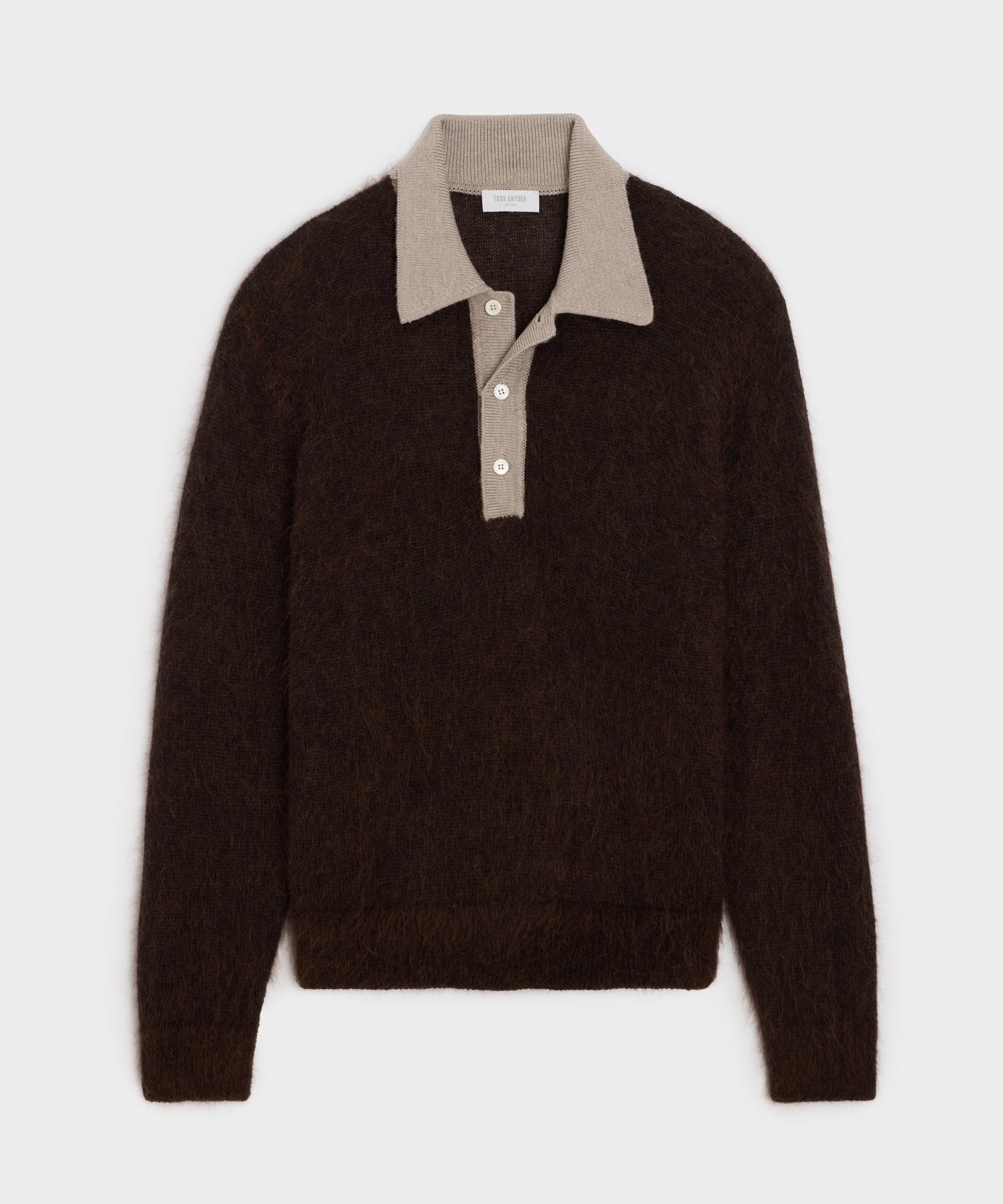This refined sweater polo is knit from a soft Italian mohair blend. brushed twice for an airy. fuzzy look and feel. while the contrasting collar and placket are knit from merino wool. It has a gently relaxed fit that's slightly fuller at the chest before tapering in a bit at the waist. which is meant to hit at approximately hip height. The perfect layering piece. slip this on over a tee to give your looks a bit of quiet luxury.