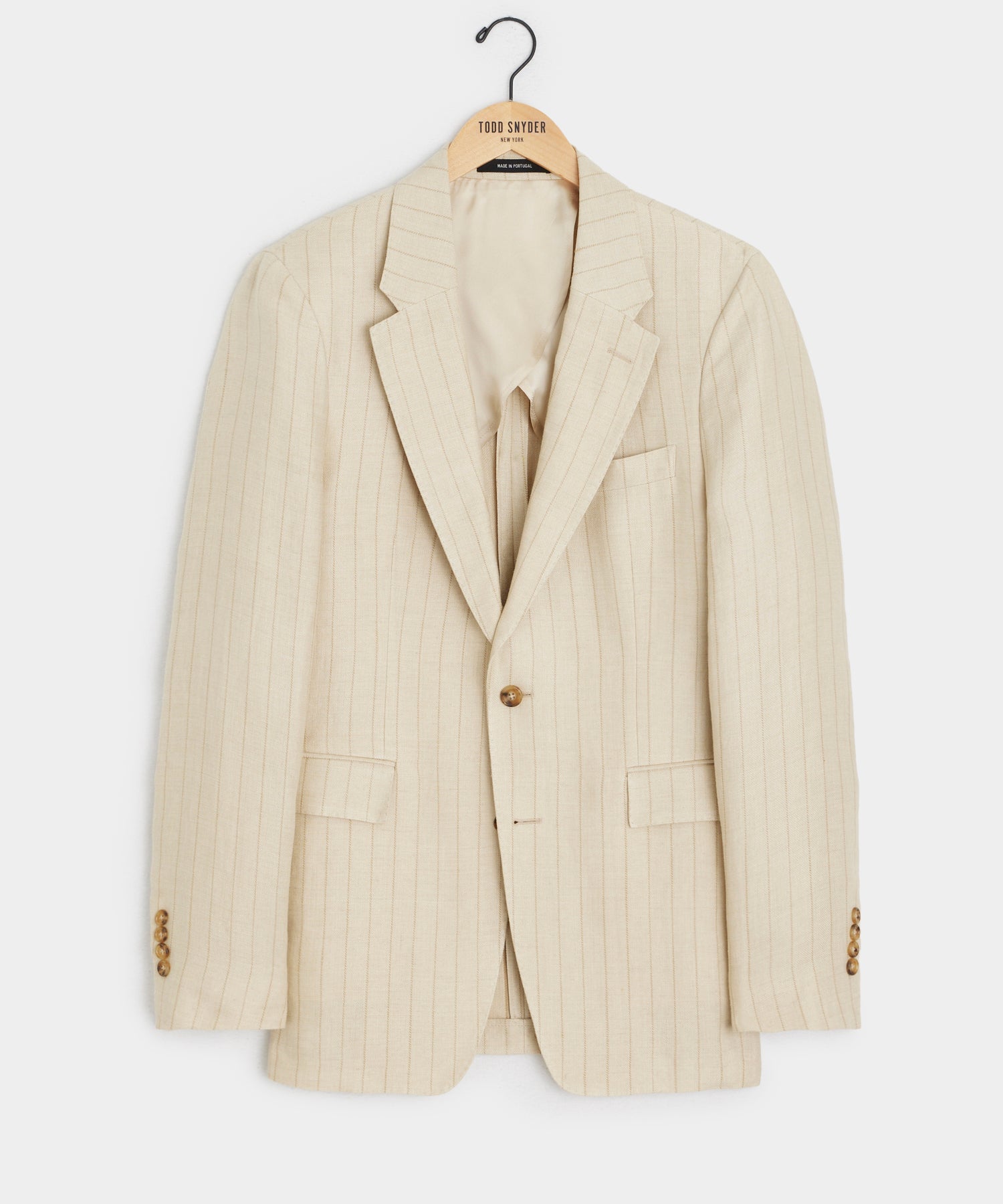 Our Sutton Suit Jacket offers a spin on a tailored sports coat; if you're looking for a suit that doesn't feel like a suit. you've found it. It's crafted from Italian linen in a chic. cream-and-brown take on a classic pinstripe. This two-button jacket features design details like a partial. lightweight lining and pick-stitching at the lapel. which gives it a handmade feel. The overall effect is clean and tailored. refined. but still easy-wearing.