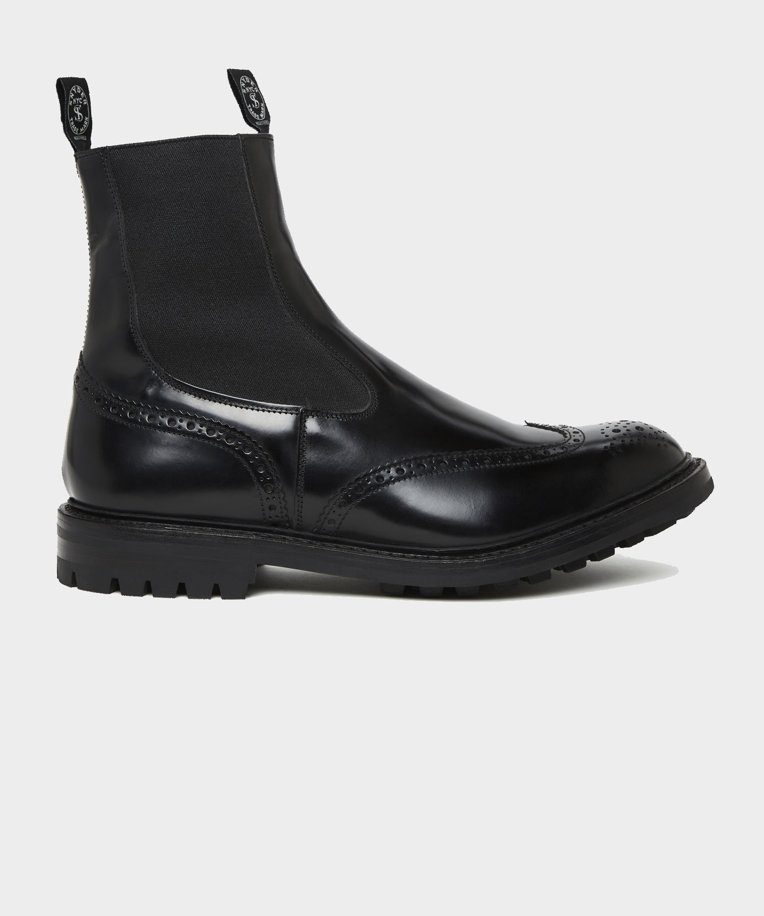 Tricker's classic brogue country boot is perfect for wear whenever you need it. This elastic-sided pull-on Chelsea boot has a storm welt. leather uppers and leather linings for a solid build and excellent comfort. held together with a Commando rubber stitched sole for grip in any terrain. One of this heritage company's bestselling styles. its simple-yet-sleek design makes it extremely versatile: wear it in the fields. hiking. or out and about town with anything from denim and tees to tailored suits. This particular pair features exclusive Todd Snyder X Tricker's co-branding at the pull tab. sole. and box.