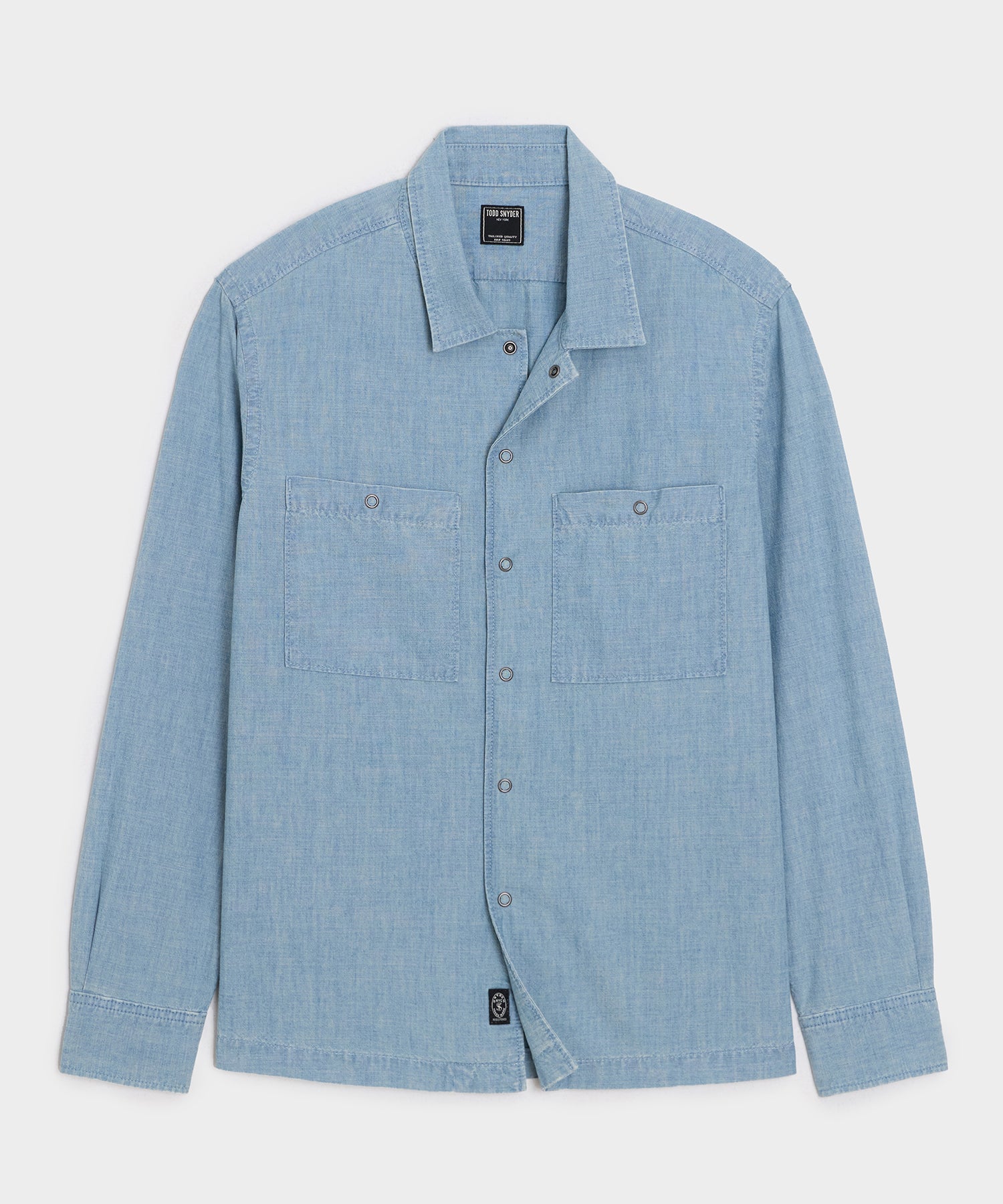 This rugged-meets-refined Mechanic Shirt is crafted from a lightweight chambray with a broken-in vintage wash. True cotton chambray. which this is. doesn't refer to the pale blue color that people often associate it with. While it often ends up resembling denim. chambray is woven differently. combining a dyed warp yarn with a white filling yarn for a softer. lighter finish. Design details include two chest pockets. a straight hem and ring snaps.