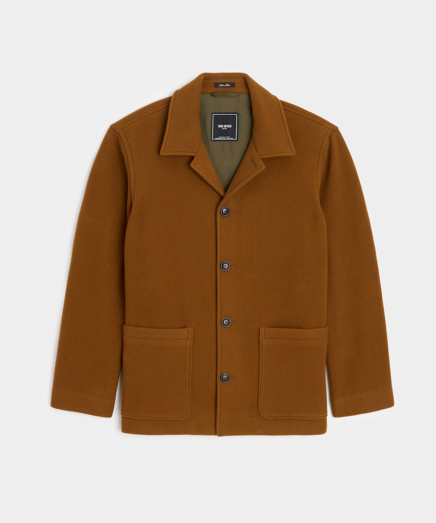 A winter-ready riff on our bestselling chore coats. this Cafe Jacket is crafted from an Italian fabric — specifically. a soft. luxe wool and cashmere blend in a rich acorn shade. The fit is easy: it hits at the hip. like your favorite peacoat. and is perfect to throw on and go. It's fully lined in our signature olive cotton bemberg. with genuine horn buttons at the front. Four pockets (two exterior. two interior) complete the look. A rugged-meets-refined layer. it's versatile enough to wear anywhere and works equally well open over a button-down on warmer days or buttoned-up over a sweater when temps dip.